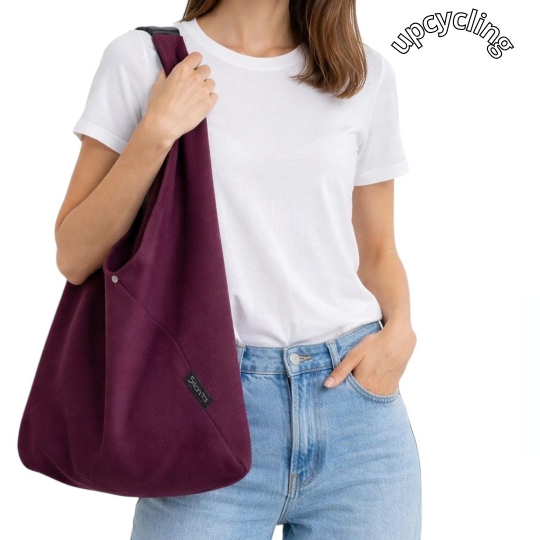 La borsa origami è un accessorio capiente e consapevole, realizzato con un tessuto felpato di fine serie, per dare nuova vita a materiali di qualità e ridurre gli sprechi.