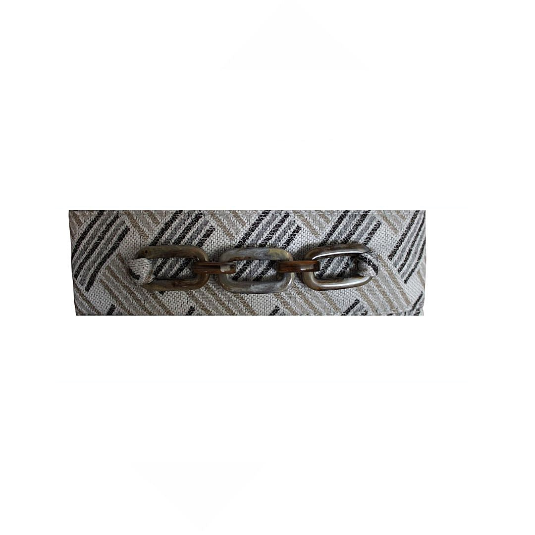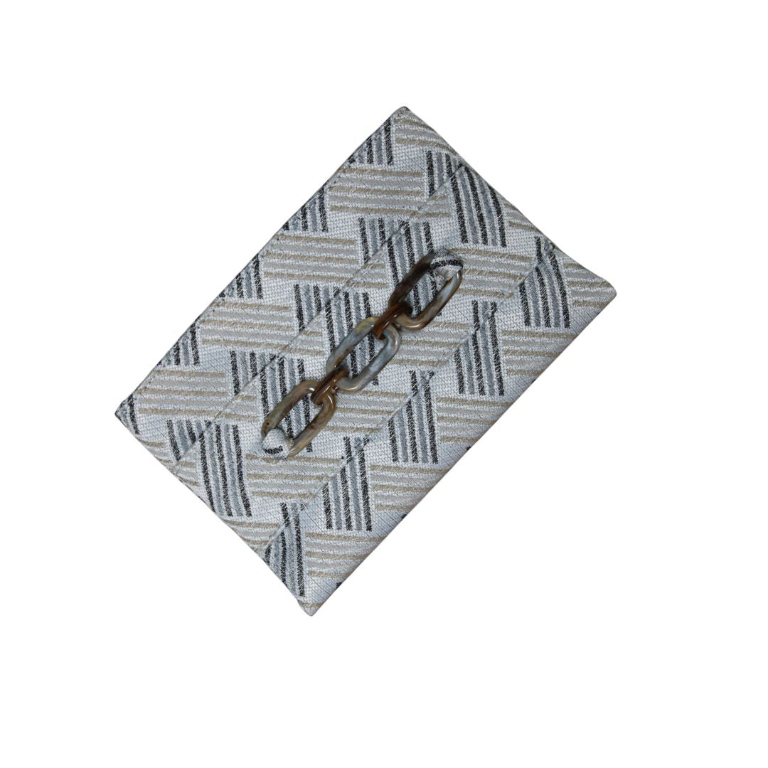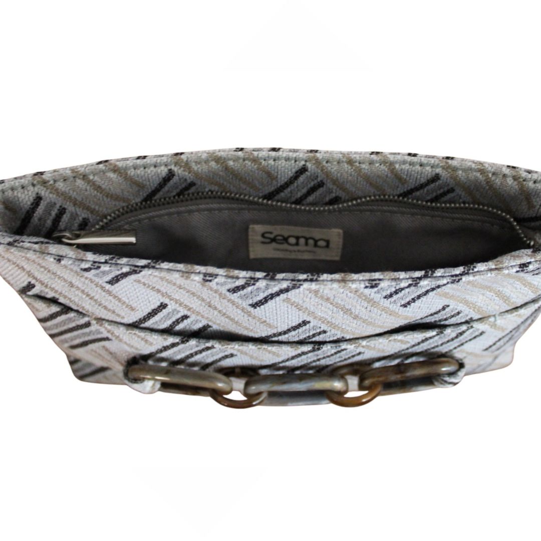 A one-of-a-kind, eco-conscious accessory crafted from end-of-line fabric scraps. Featuring a secure and practical zipper, this bracelet purse is enhanced by a recycled plexiglass detail that also functions as a decorative bracelet. Elegant yet functional, this bracelet bag is designed to be worn on the wrist, so you can carry it hands-free without needing to set it down. A smart blend of design, craftsmanship, and environmental care. Color: Light grey base with a geometric herringbone pattern made of diagonal lines in black, grey, and gold. Handmade in Italy. Size: 18 cm (h) x 29 cm (w)