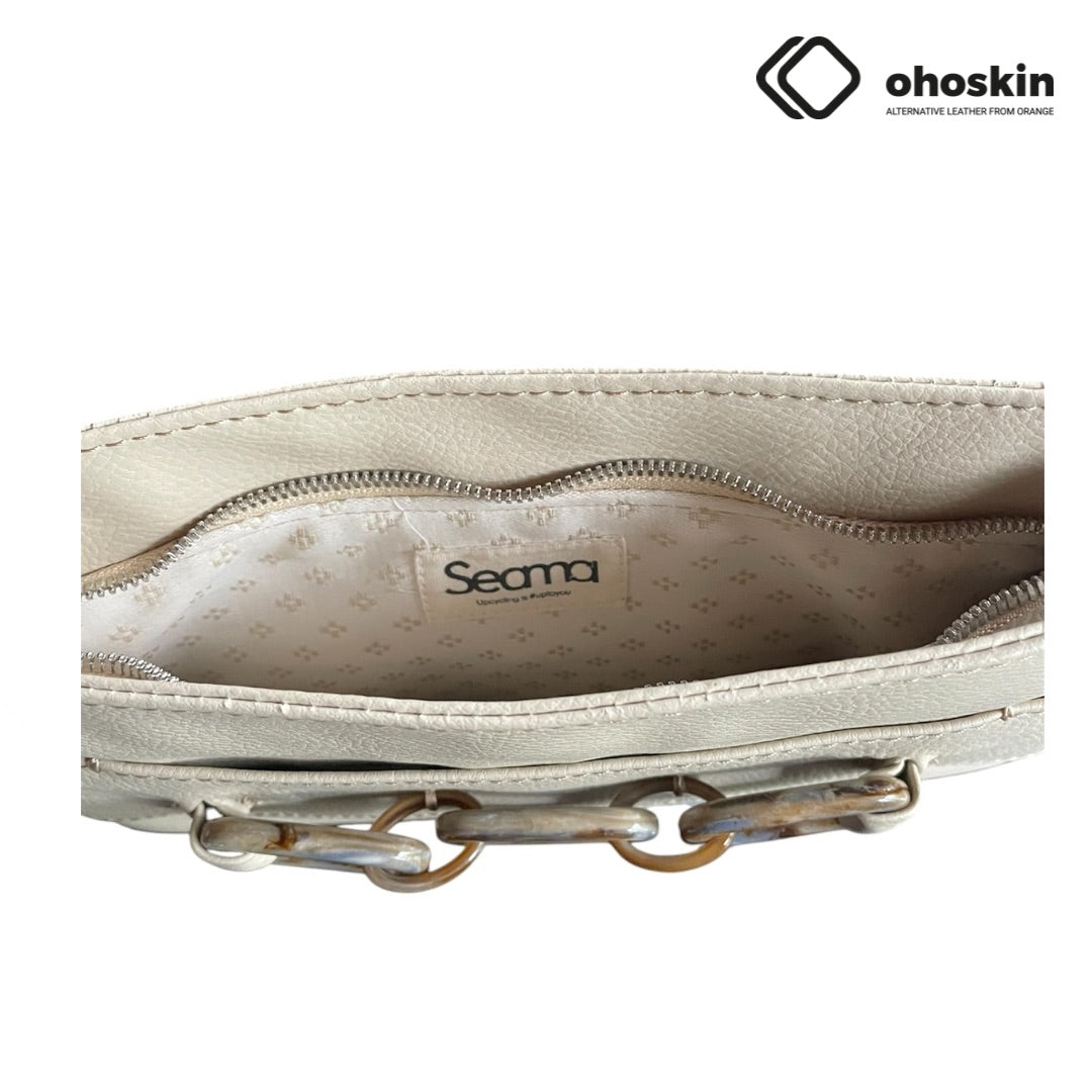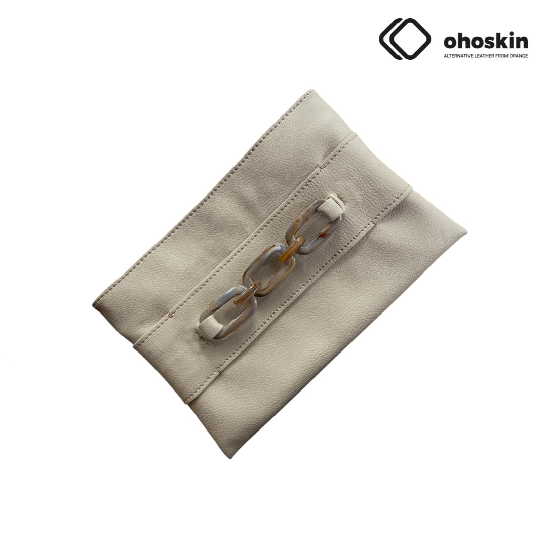 A unique and sustainable clutch bag, made of eco-leather, Ohoskin, derived from orange peel and cactus waste. Equipped with a practical and safe zipper, it is embellished with a recycled plexiglass detail, which also acts as a decorative bracelet. This Party Purse is elegant and functional, you can keep it with you without having to put it down, leaving your hands completely free. An innovative accessory that combines design, craftsmanship and respect for the environment.