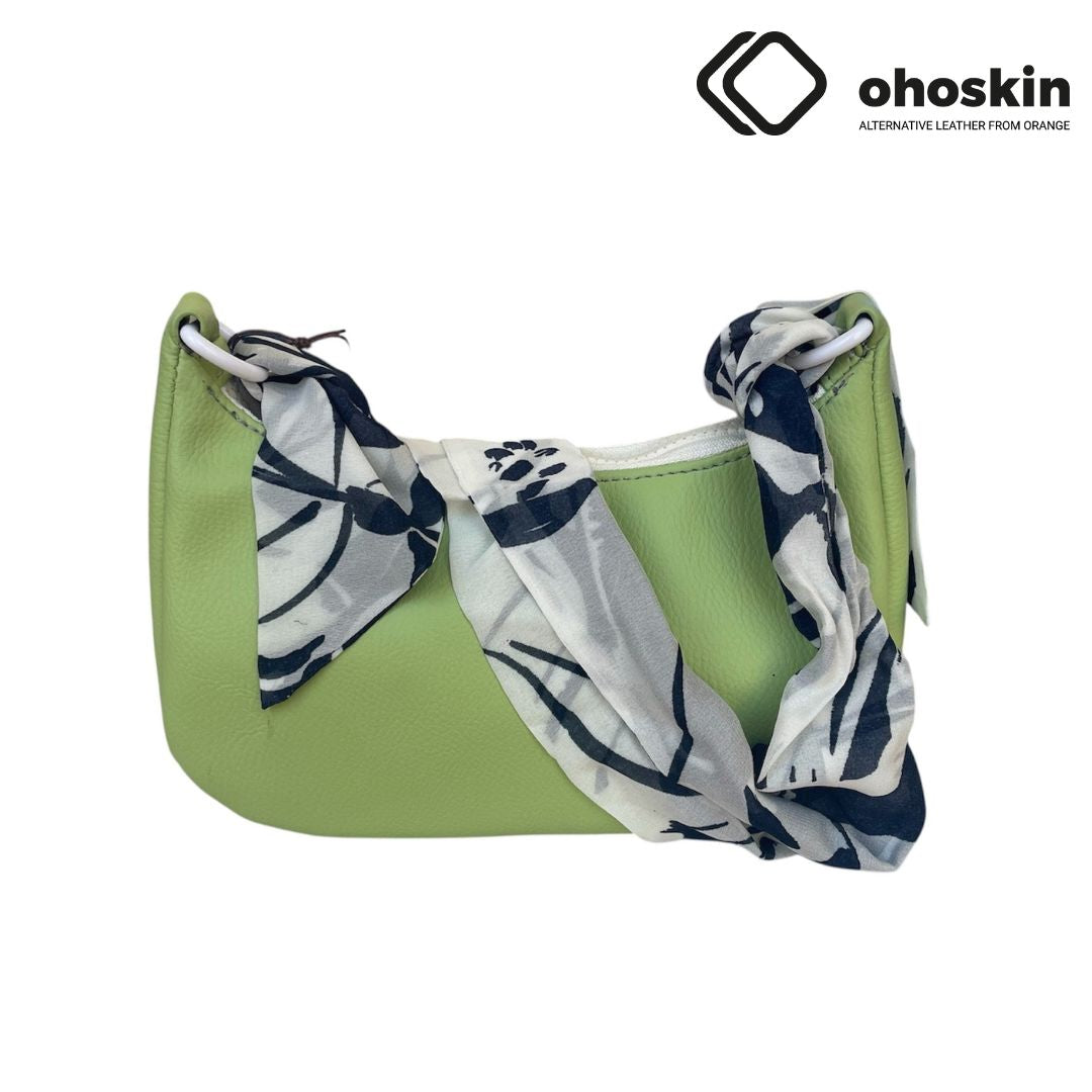 La Petite Lune Maia è una borsa compatta ma sorprendentemente capiente, perfetta per portare con sé l’essenziale: cellulare, portafoglio, fazzoletti e chiavi. È realizzata in ecopelle Ohoskin, un materiale innovativo e sostenibile ottenuto dagli scarti della buccia d’arancia e del cactus. Questo tessuto ecologico unisce eleganza e rispetto per l’ambiente, offrendo una texture morbida e raffinata. Completano il design una tracolla regolabile con foulard a fantasia floreale, che aggiunge un tocco di stile e originalità.
