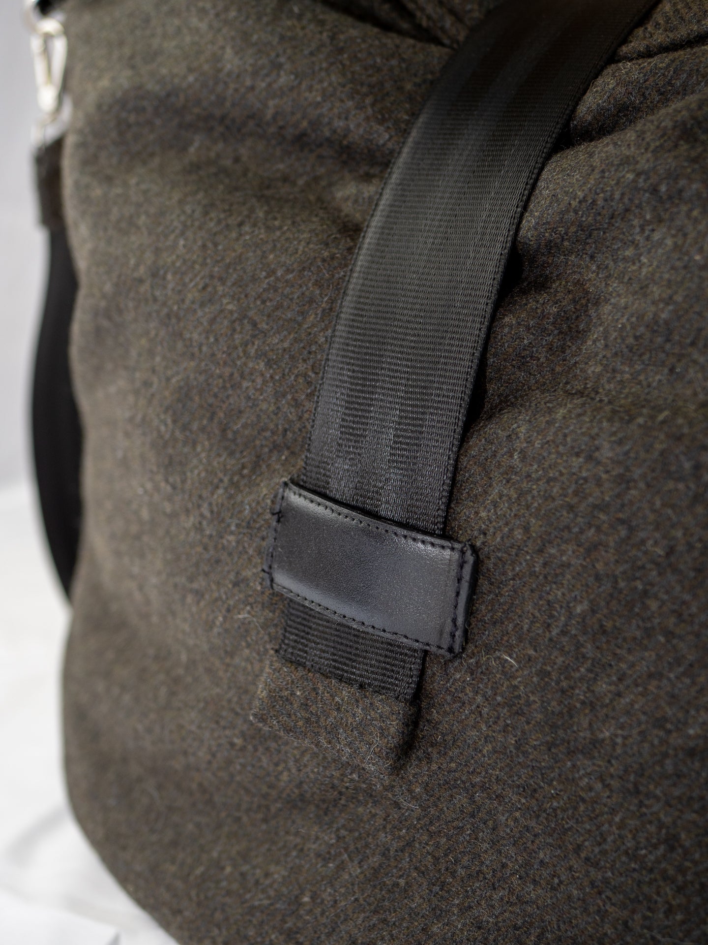 The adjustable shoulder strap and locking buckle come from refurbished seat belts.