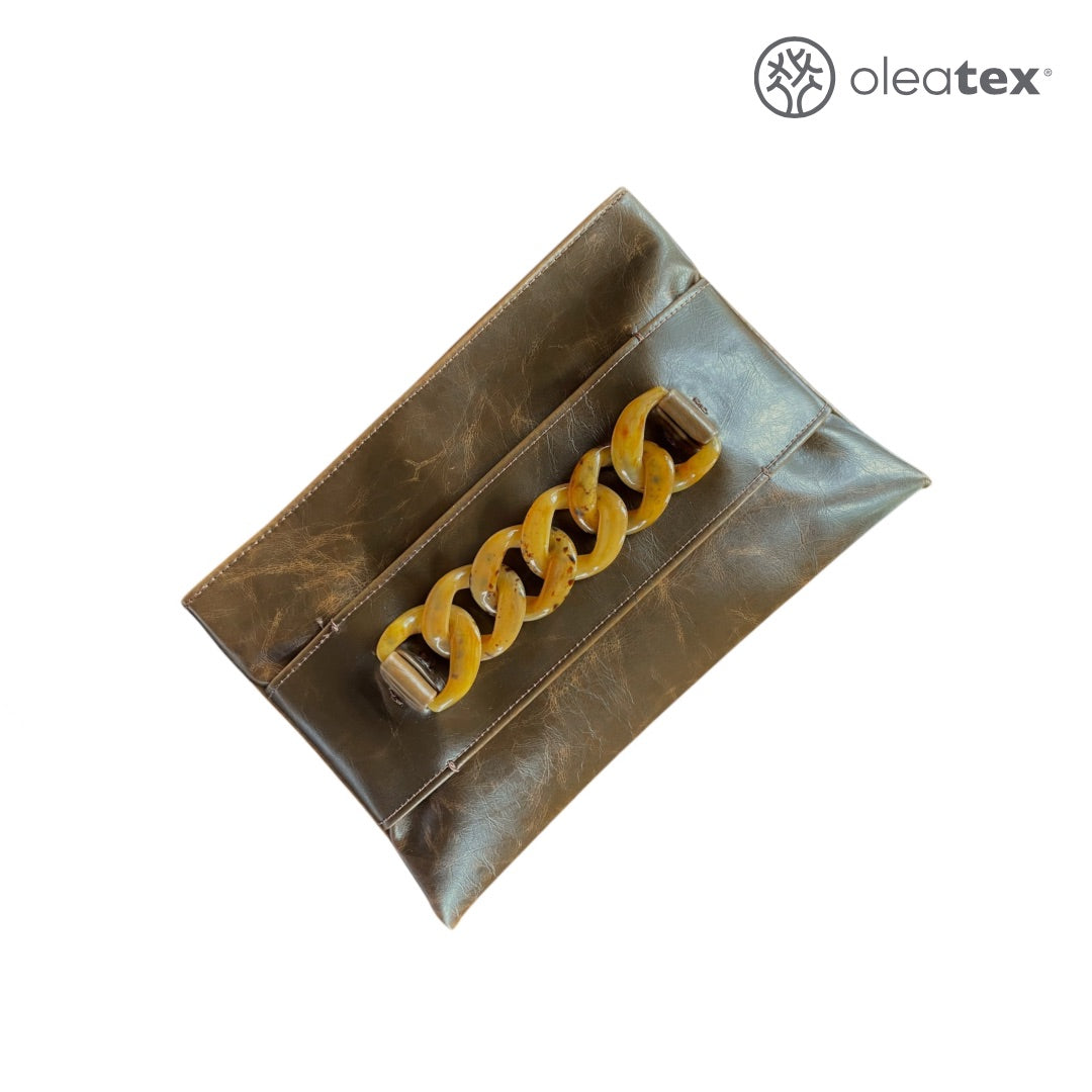 Una pochette unica e sostenibile, realizzata in ecopelle, Oleatex, prodotta dagli scarti della lavorazione delle olive. Dotata di una cerniera pratica e sicura, è impreziosita da un dettaglio in plexiglass riciclato, che funge anche da braccialetto decorativo. Questa borsa braccialetto è elegante e funzionale, puoi tenerla con te senza doverla appoggiare, lasciando le mani completamente libere. Un accessorio innovativo che unisce design, artigianalità e rispetto per l’ambiente.