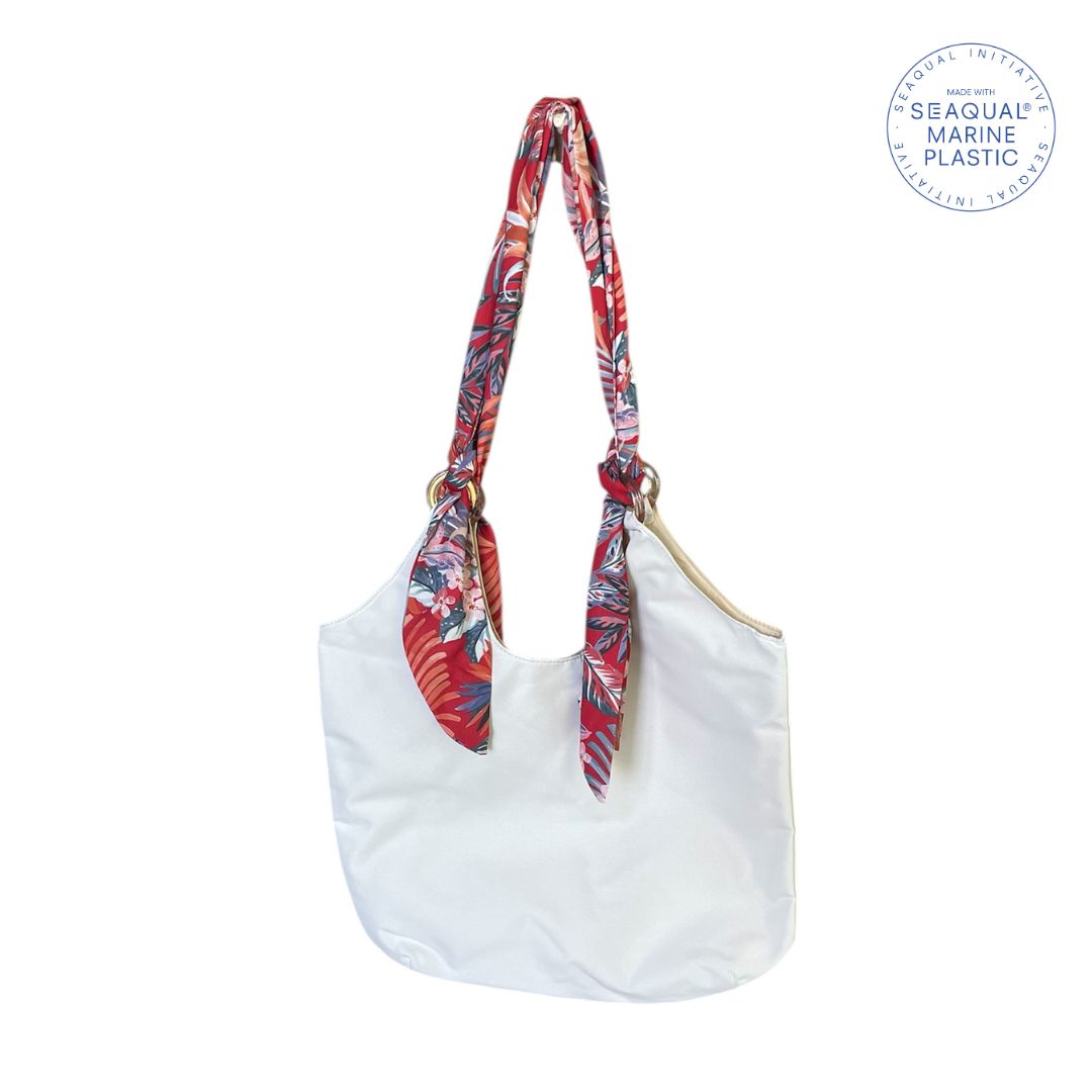Realizzata in poliestere riciclato al 100% certificato proveniente da SEAQUAL® MARINE PLASTIC. Questo tessuto contiene circa il 10% di rifiuti marini di plastica ed il 90% è costituito da PET post-consumo proveniente dalla terraferma. Questa borsa foulard è foderata internamente e dotata di una pratica tasca per piccoli oggetti. I manici, ottenuti da foulard a stampa floreale multicolore, aggiungono un tocco di eleganza e vivacità al suo design minimal.