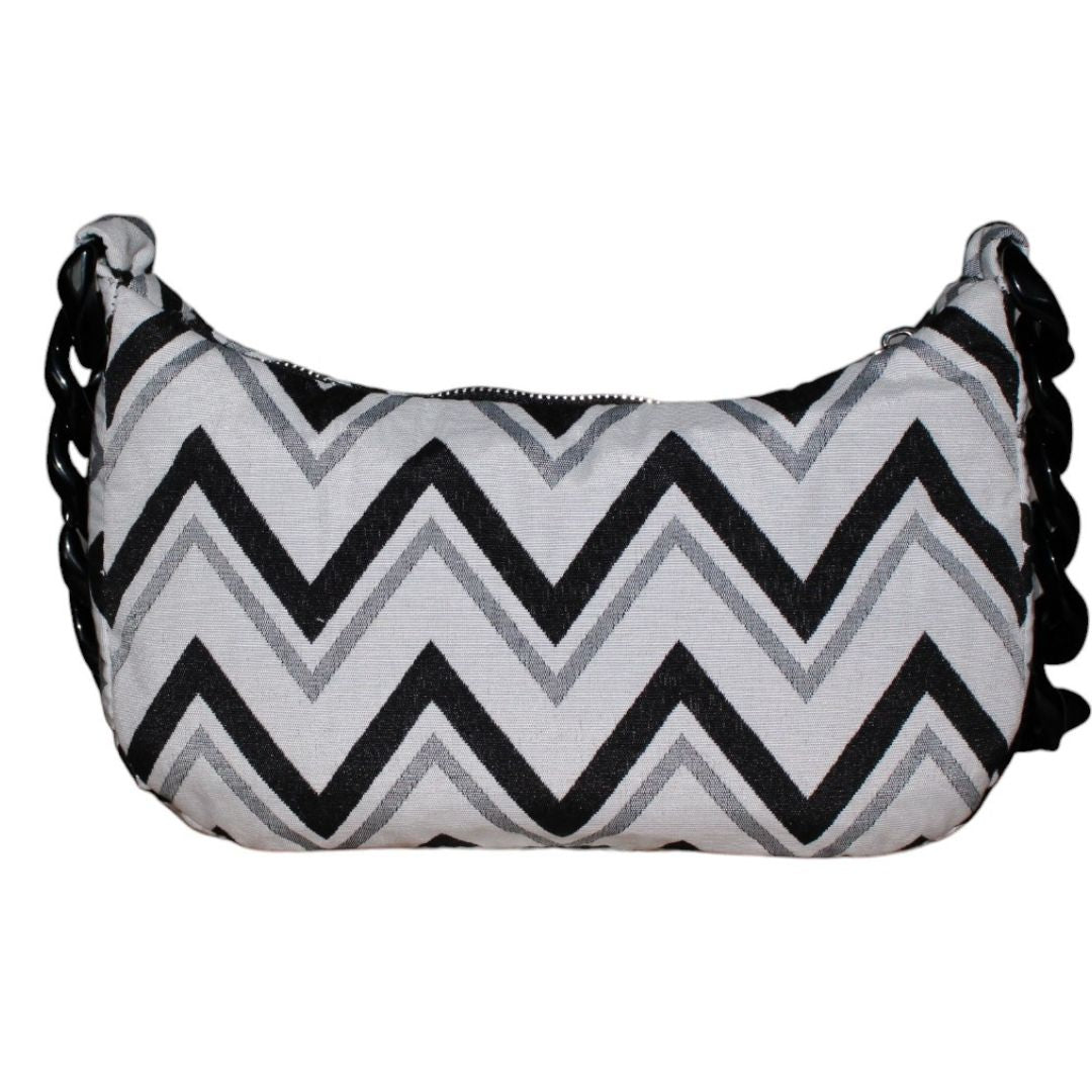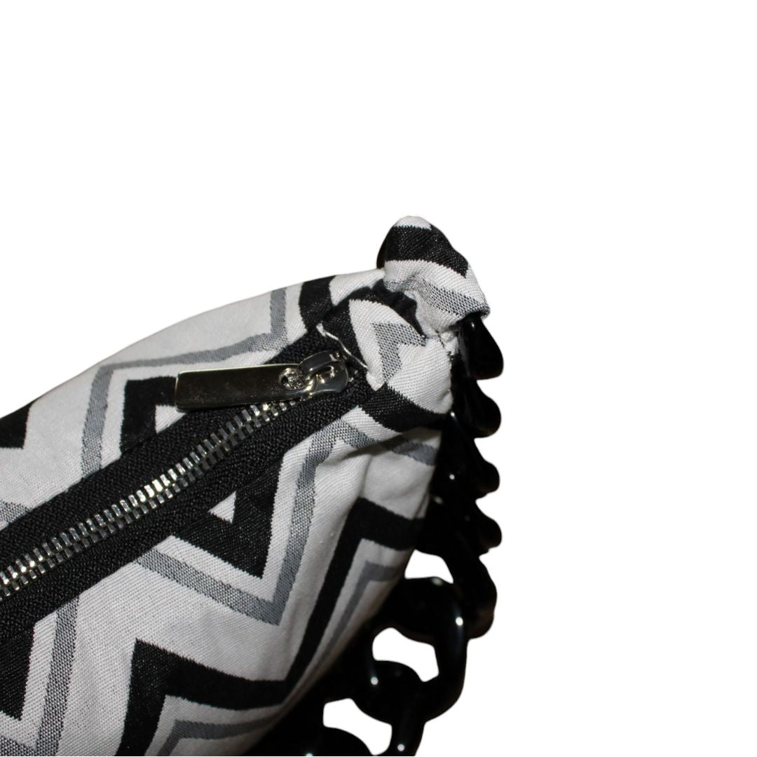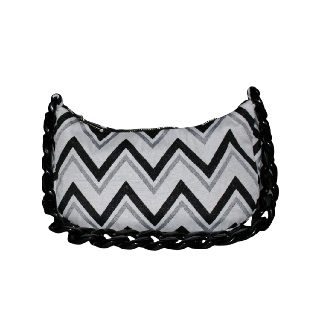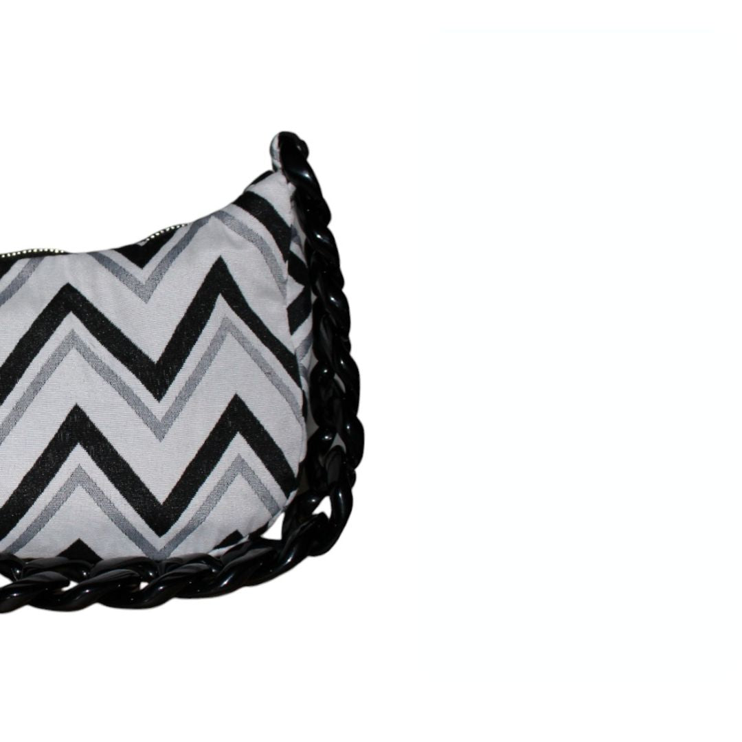 La Petite Lune Izar è una borsa di dimensioni ridotte ma capiente. Può contenere il cellulare, il portafoglio, i fazzoletti e le chiavi. La sua catena nera in plexiglass ed il tessuto a fantasia zigzag nei colori nero, grigio e bianco sono un connubio di eleganza e semplicità. La Petite Lune Izar unisce design distintivo e praticità, ideale per ogni occasione.