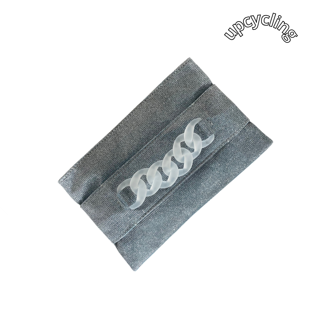Una pochette unica e sostenibile, realizzata in tessuto proveniente da scarti di fine serie. Dotata di una cerniera pratica e sicura, è impreziosita da un dettaglio in plexiglass riciclato, che funge anche da braccialetto decorativo. Questa borsa braccialetto è elegante e funzionale, puoi tenerla con te senza doverla appoggiare, lasciando le mani completamente libere. Un accessorio innovativo che unisce design, artigianalità e rispetto per l’ambiente.