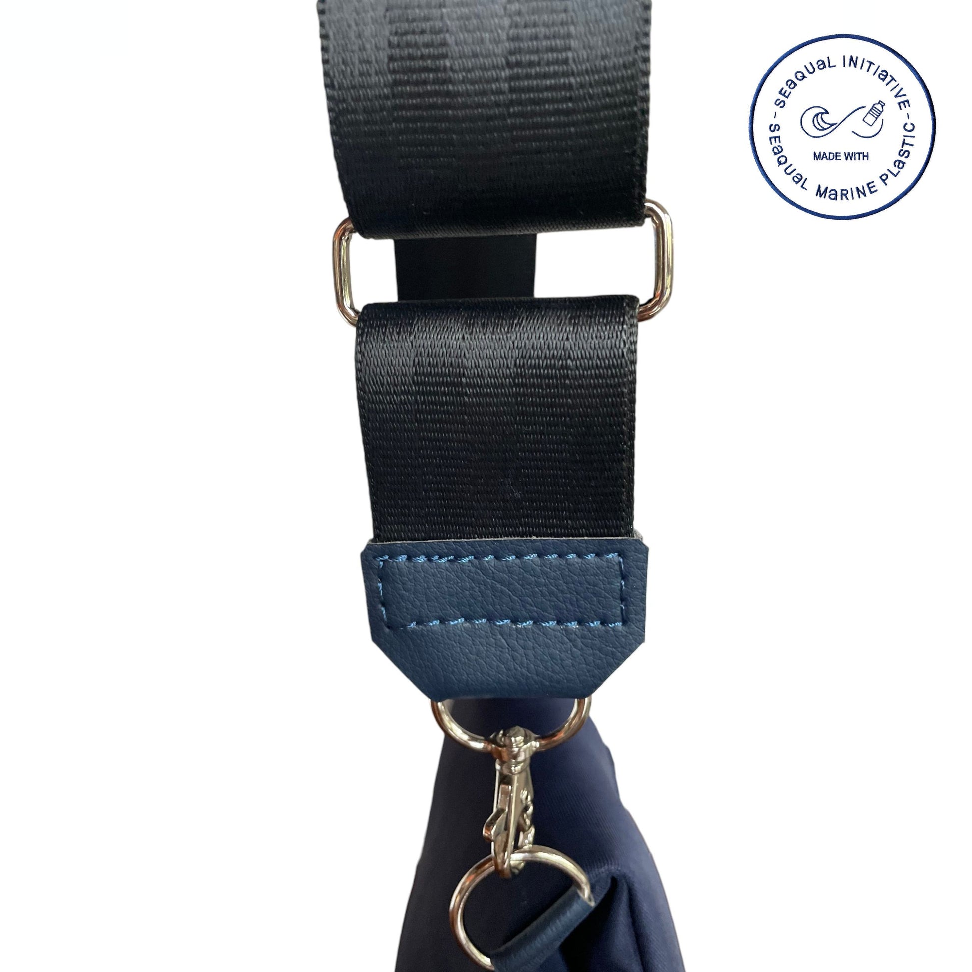 La tracolla regolabile è ottenuta dal recupero e dalla rigenerazione di cinture di sicurezza, mentre gli anelli laterali permettono di indossare il modello sia a mano che a tracolla.