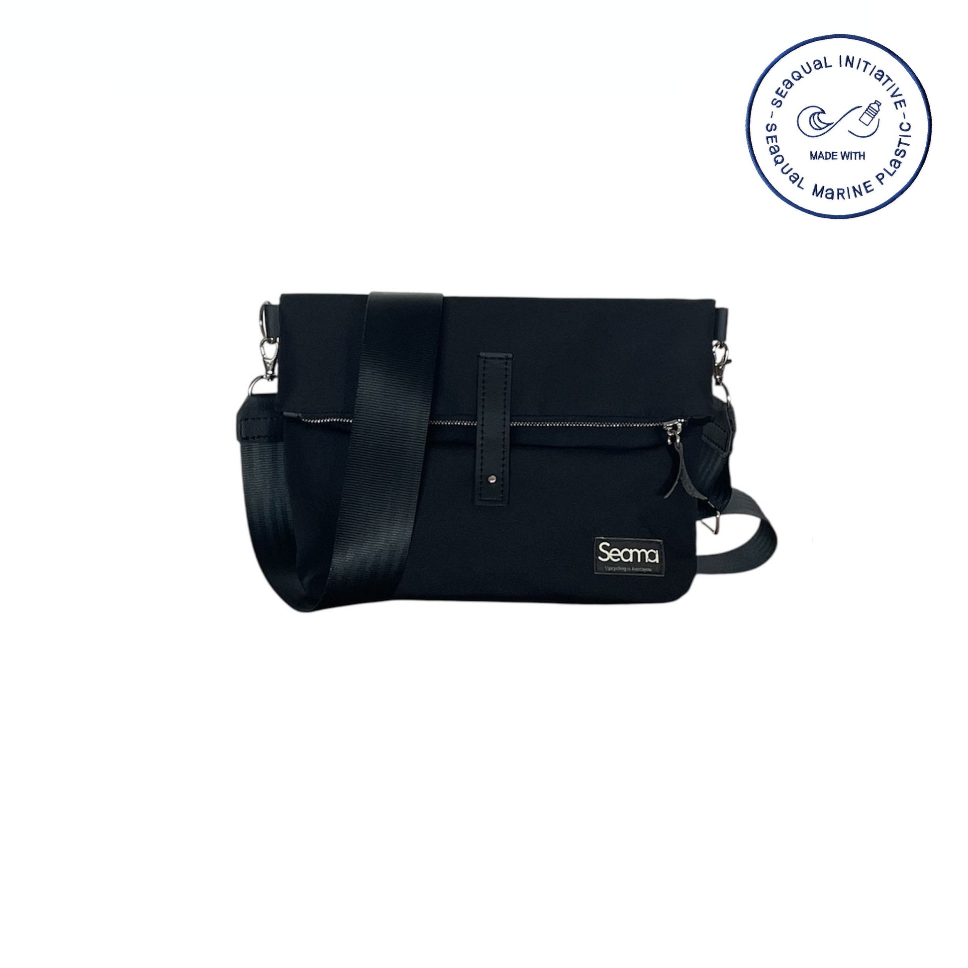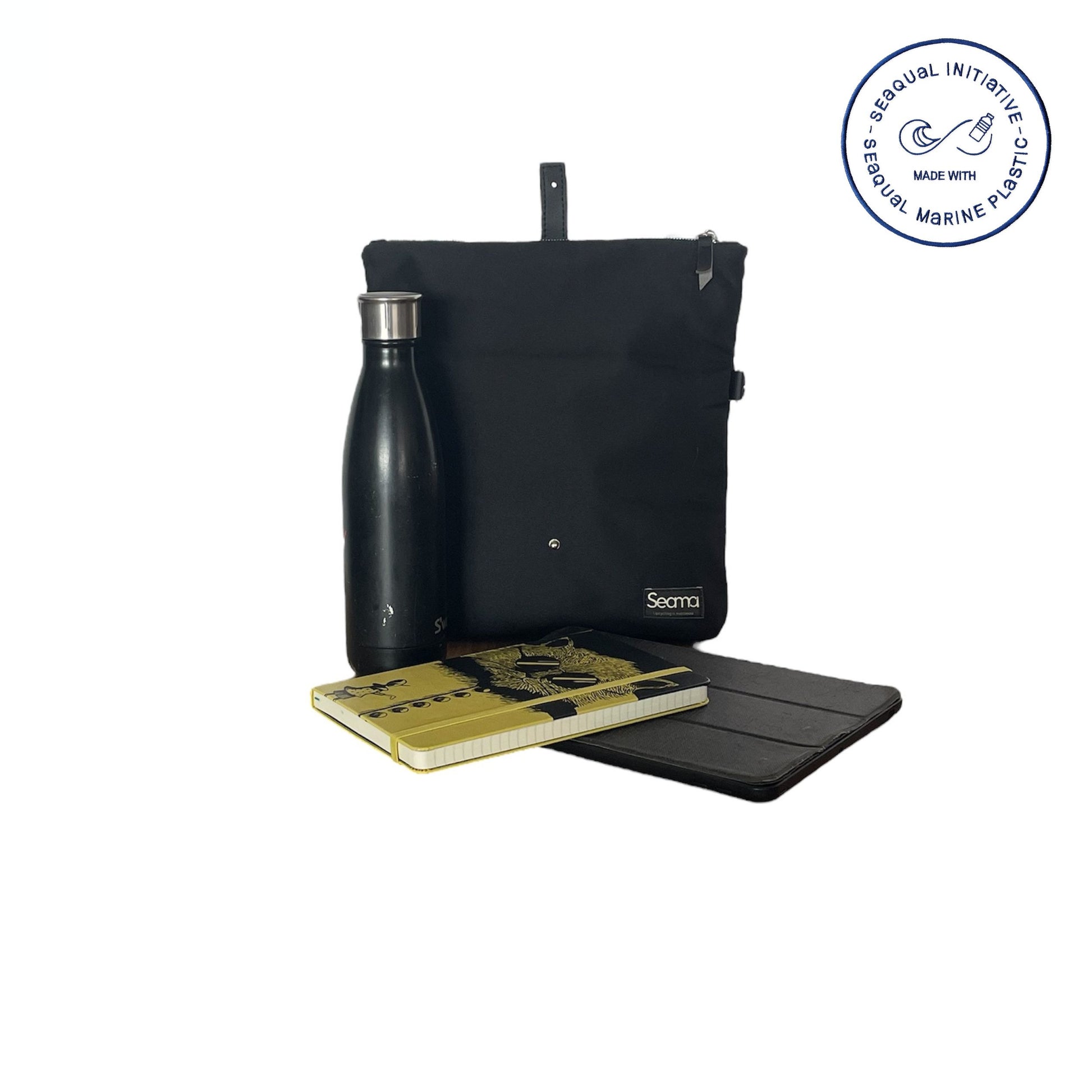 Compatta, pratica e dal design minimalista, questa borsa unisex è realizzata in 100% poliestere riciclato certificato SEAQUAL® MARINE PLASTIC, un tessuto sostenibile composto per circa il 10% da rifiuti marini in plastica e per il restante 90% da PET post-consumo proveniente dalla terraferma.
