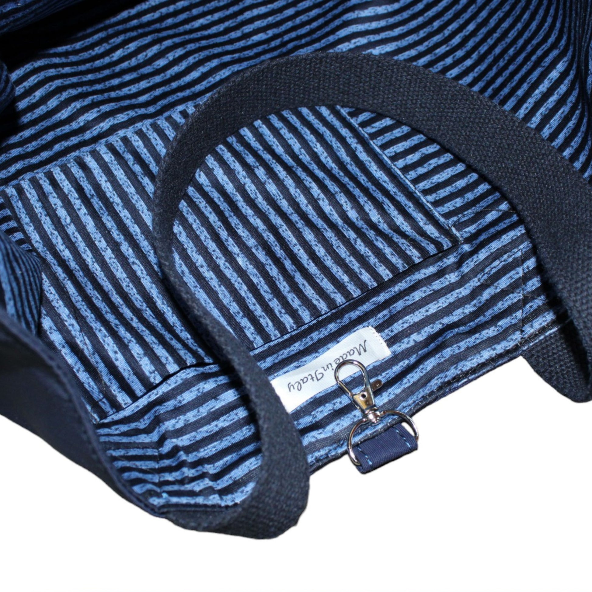 Rivestita all'interno in jersey riciclato, la borsa Asana è dotata di uno spazio appositamente progettato per il tuo tappetino yoga, uno scomparto capiente per i tuoi accessori, una tasca interna ed una chiusura con gancio.