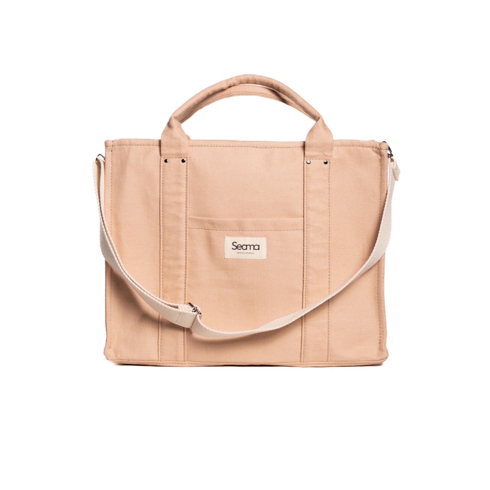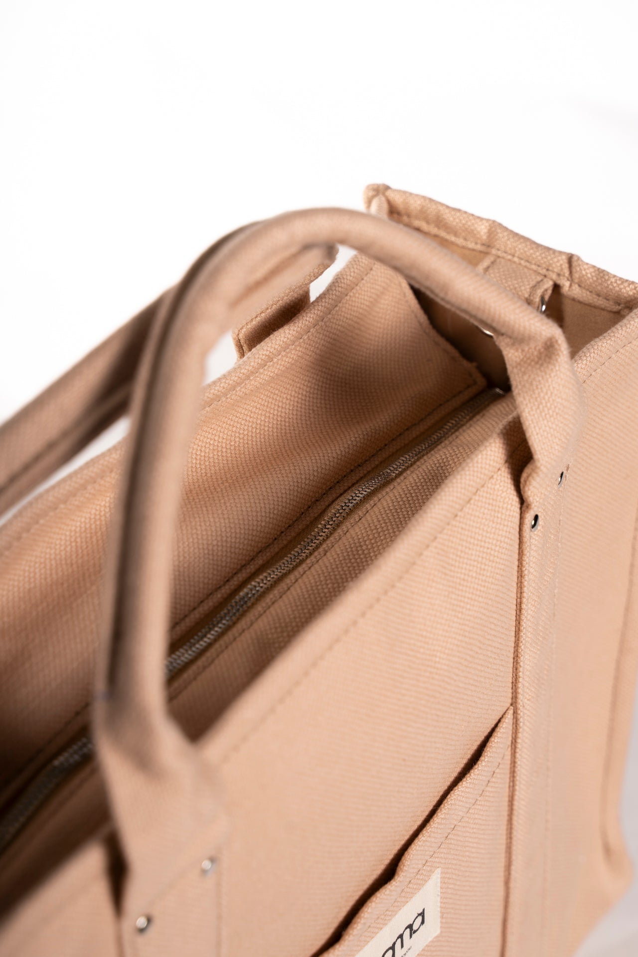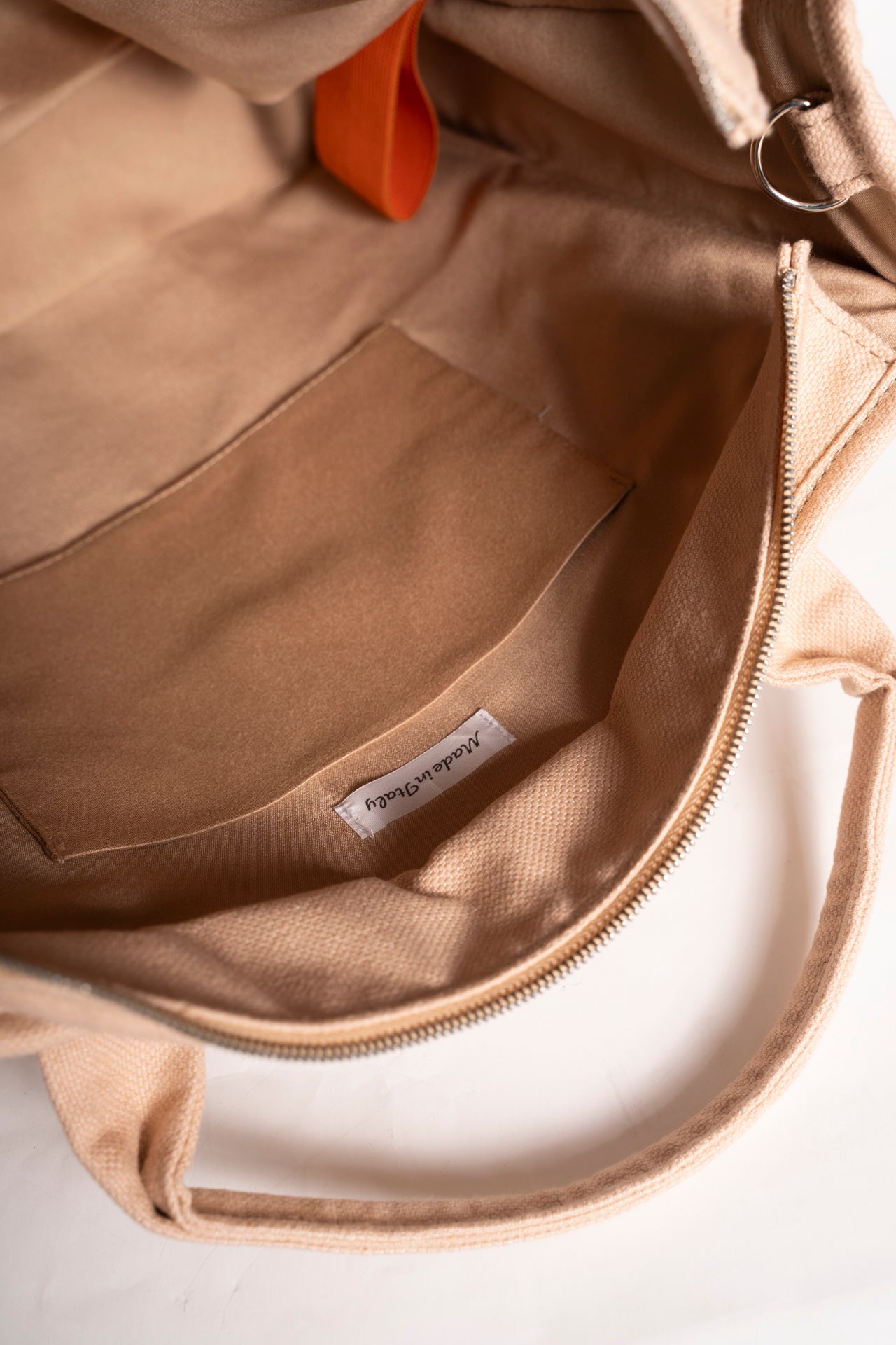 Capiente e resistente, la Tote Madrid grande può contenere anche il tuo laptop con un'eleganze contemporanea e raffinata. Può essere portata a mano o con la tracolla panna regolabile, la Tote Madrid grande ha una chiusura a zip, una tasca esterna per il cellulare e una interna per piccoli oggetti. E' anche dotata di un porta bottiglia interno creato con un elastico arancione.