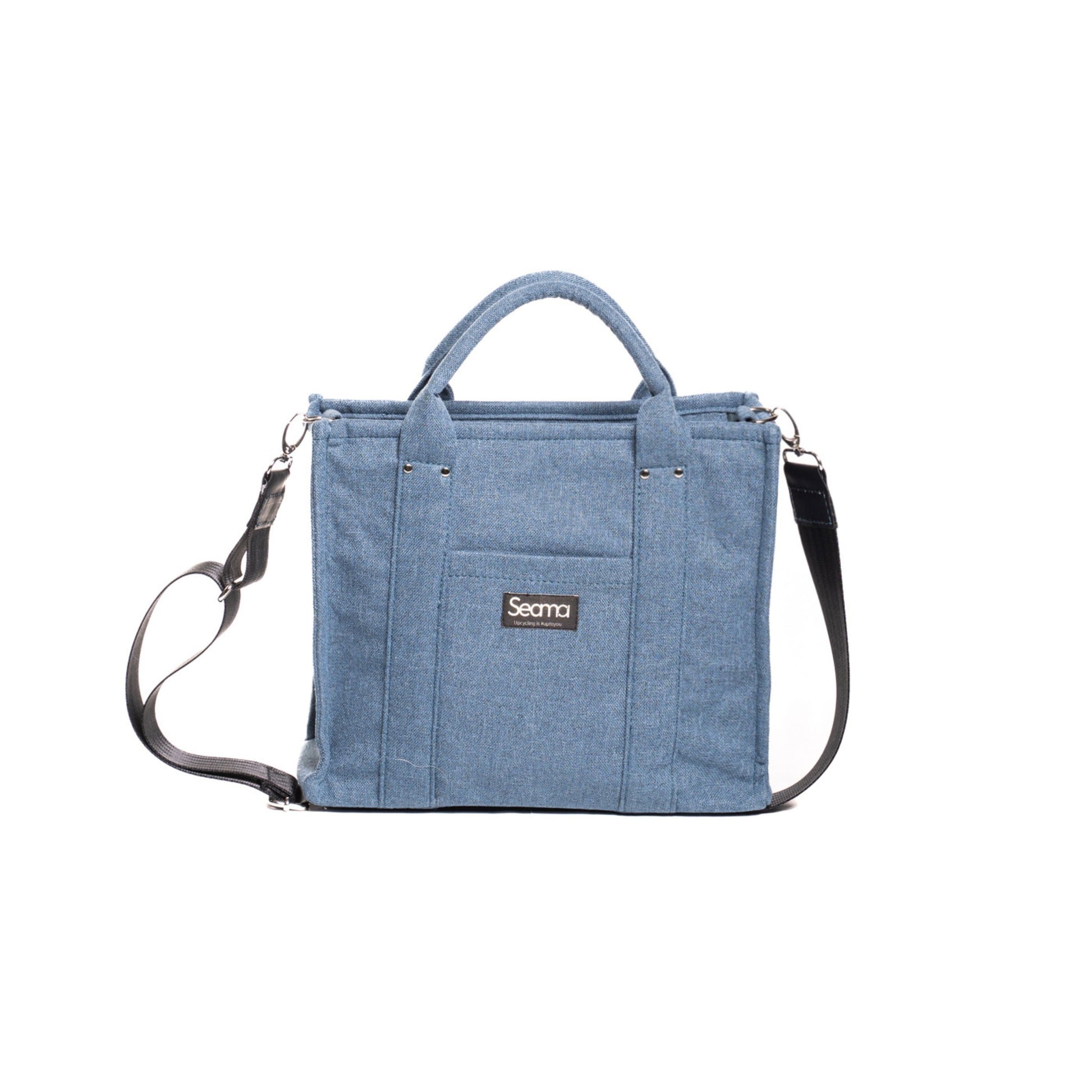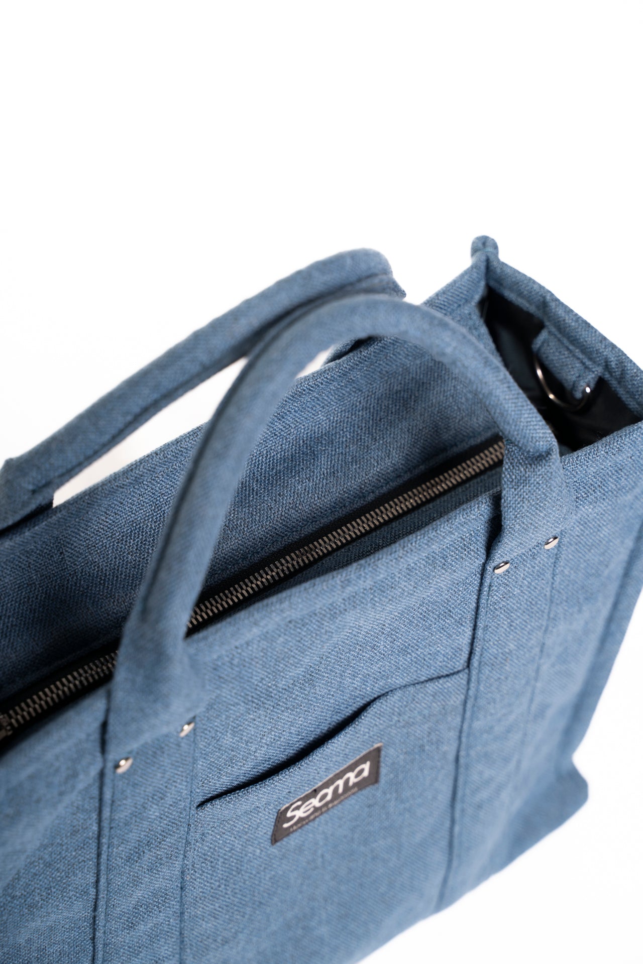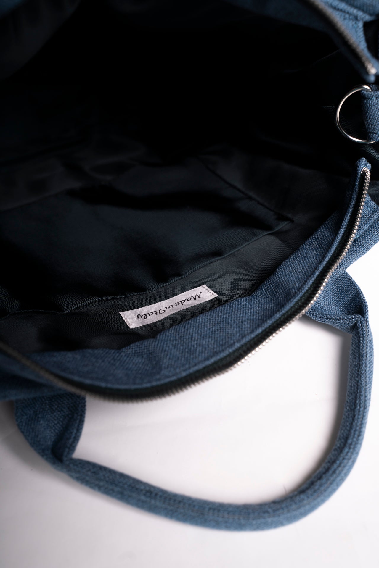 Elegante e casual, la Tote Praga media ti porta in un viaggio di stile senza tempo. Può essere portata a mano o con la tracolla nera regolabile, la Tote Praga media ha una chiusura a zip, una tasca esterna per il cellulare e una interna per piccoli oggetti. E' anche dotata di un porta bottiglia interno creato con un elastico nero. Made in Italy, fatta a mano. Colore: blu denim
