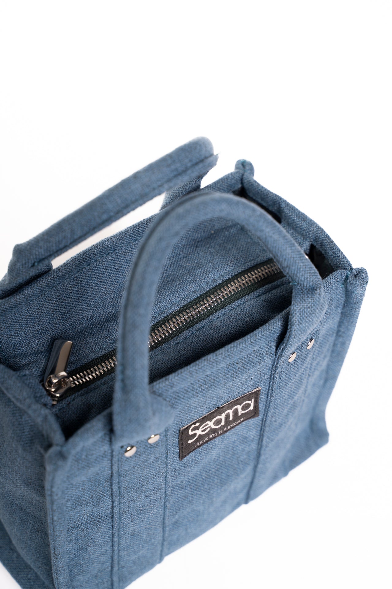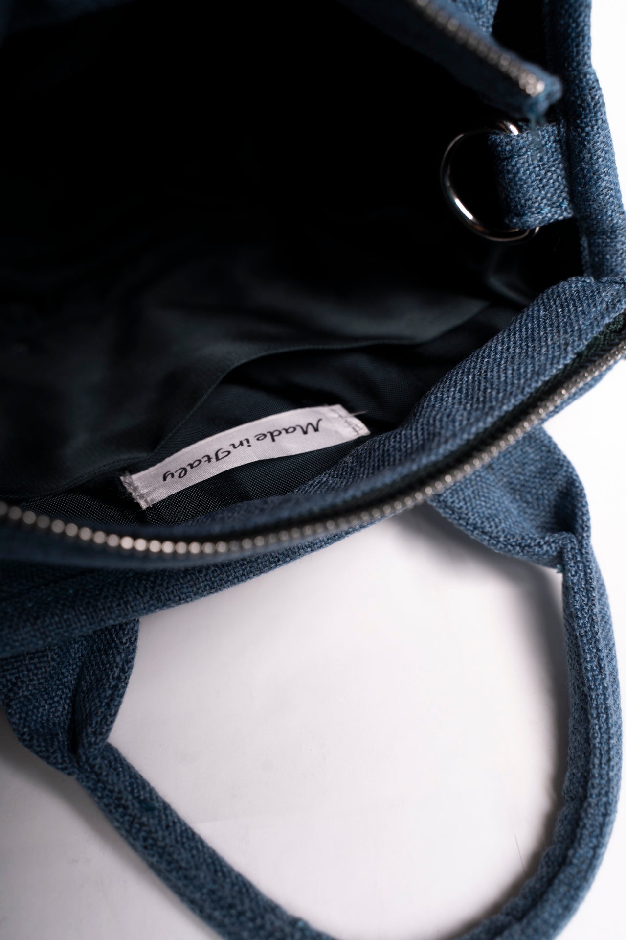 La prevalenza di materiali di recupero ed il processo di upcycling consentono di ridurre i consumi inerenti alla produzione e sottrarre tessuti alla discarica. Piccole imperfezioni non sono da attribuirsi a un difetto di fabbricazione ma alla particolarità del materiale e della produzione artigianale in upcycling.
