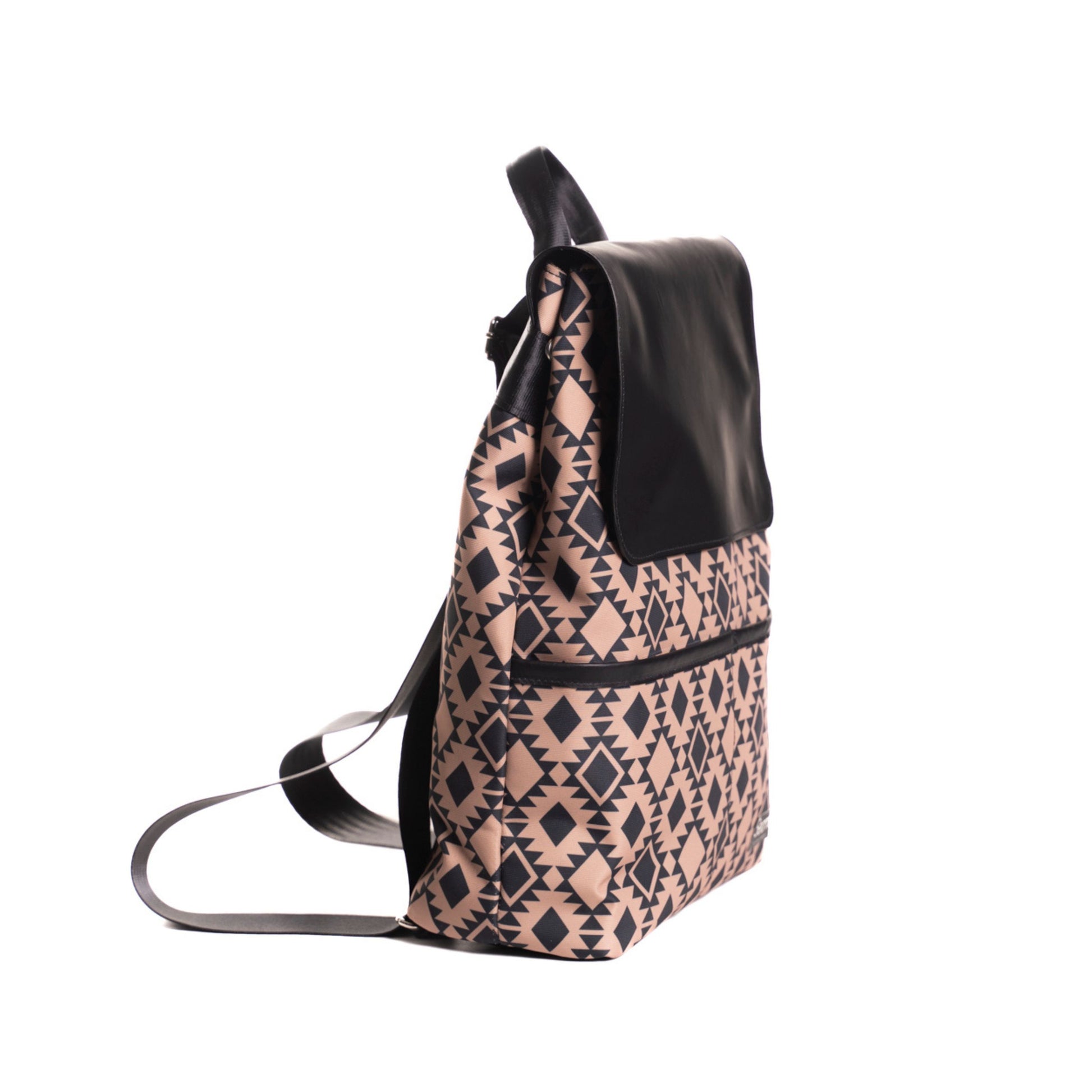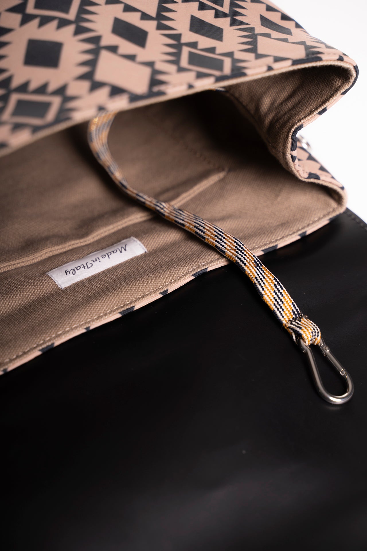 Colore: tessuto beige scuro a losanghe nere, con patta, fondo e profili in pelle nera